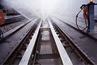 高速動車組列車在高速行駛中帶起的雪花結(jié)成了冰,附著在列車地盤上,這些冰層會影響機(jī)械師對列車地盤的檢查,對行車安全帶來隱患。因此在檢修前,機(jī)械師們先要把列車地盤和輪軸上的冰清除干凈。這些冰大多聚集在地盤零件的空隙里,凍的非常結(jié)實,要想把它們處理干凈,傳統(tǒng)的方法是用特制的工具,一點點往下鏟。為此,北京德高潔清潔設(shè)備有限公司組織技術(shù)力量,研發(fā)了一款全自動高速動車組列車底盤、輪軸除冰系統(tǒng)。