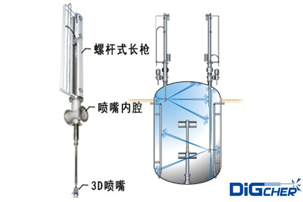 德高潔全自動不銹鋼反應(yīng)釜清洗系統(tǒng)具體清洗流程是將三維旋轉(zhuǎn)噴頭伸縮機(jī)構(gòu)安裝在反應(yīng)釜入孔上,伸縮桿伸進(jìn)反應(yīng)釜內(nèi),伸縮機(jī)構(gòu)可采用手動、電動、液壓等控制,伸縮桿在反應(yīng)釜內(nèi)伸縮和沿反應(yīng)釜內(nèi)壁周圍方向移動。根據(jù)具體實(shí)際情況可選用2孔或4孔三維自動旋轉(zhuǎn)噴頭,當(dāng)三維自動旋轉(zhuǎn)噴頭水平旋轉(zhuǎn)時(shí),水射流形成的旋轉(zhuǎn)力矩帶動噴嘴在垂直面內(nèi)旋轉(zhuǎn)。由于三維旋轉(zhuǎn)噴頭與伸縮桿的復(fù)合運(yùn)動,高壓水射流可以覆蓋反應(yīng)釜內(nèi)任何位置,從而完成反應(yīng)釜的清洗。